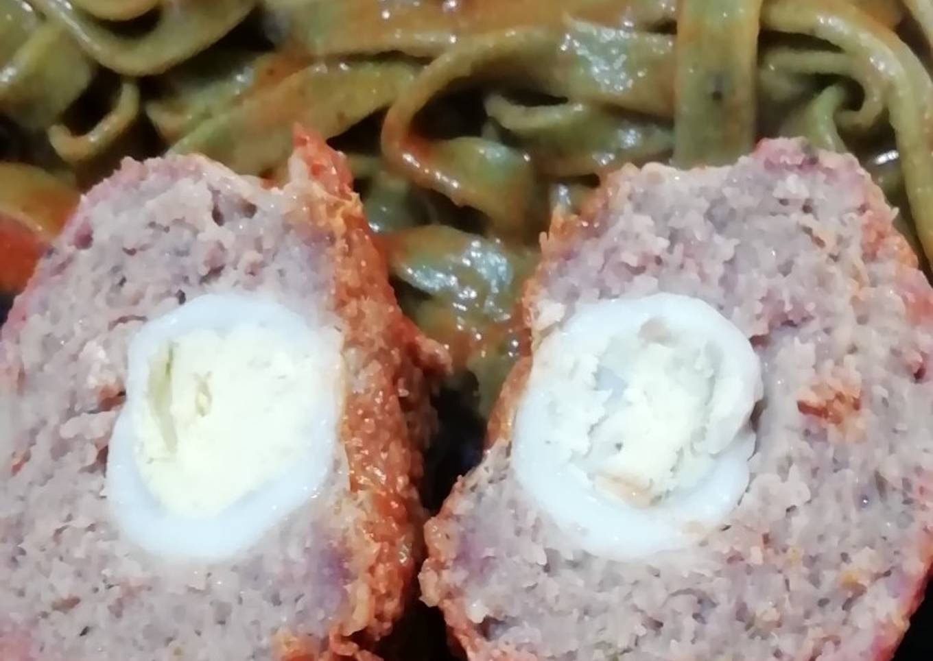 - Hacemos una albóndiga y luego la aplastamos. Ponemos en el centro un huevo y la volvemos a cubrir.