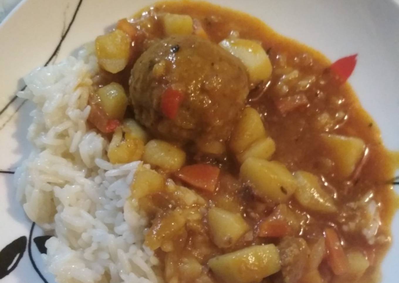 - Una vez cocinadas agregar pulpa de tomate y las albóndigas. Agregar papas, arroz para acompañar y listo. Buen provecho