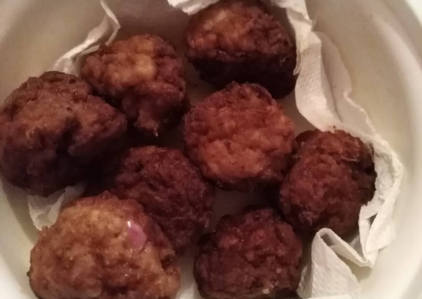 - Calentar aceite en una sartén, con la mano ir armando bolas (las mías eran chiquitas, tamaño pelota de ping pong), pasarlas por la harina y al aceite. Ir dando las vuelta a medida que se van cocinando. (yo por las dudas las deje un poco más porque tenía miedo que por dentro estuvieran crudas y salieron cocidas y jugosas)