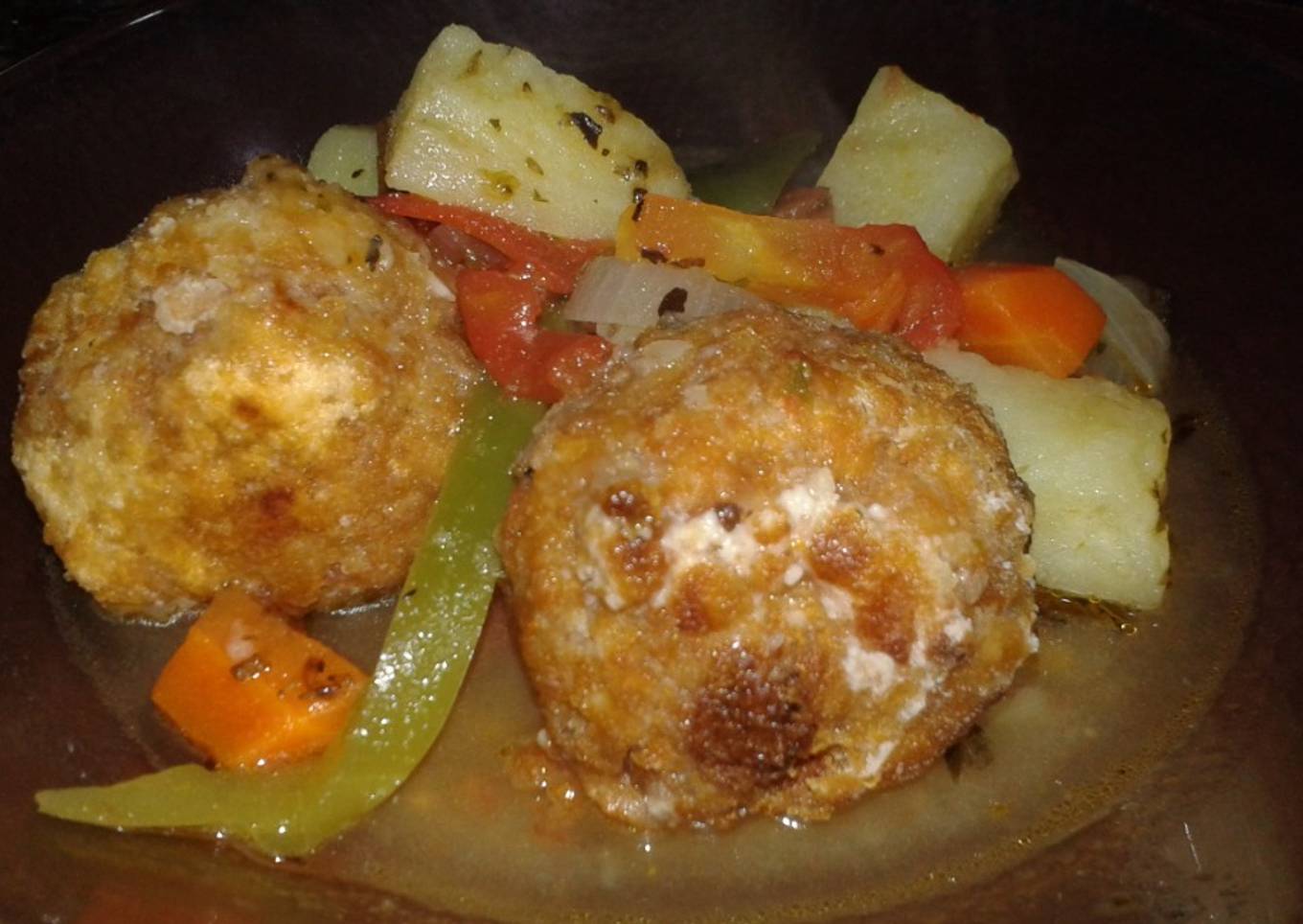 - Para la base del guiso: saltamos las verduras con un poquito de aceite. Levantamos el fondo de cocción agregando una o dos tazas de agua caliente o caldo e incorporamos las papas y zanahorias hervidas. Salamos y condimentados a gusto. IMPORTANTE: estas albóndigas NO soportan cocciones prolongadas... La primera vez que las hice se me destrozaron! NO las metas a la olla con el guiso porque se van a romper. Si querés mantenerlas calientes ponelas un toque en horno bajo o freílas a último momento!