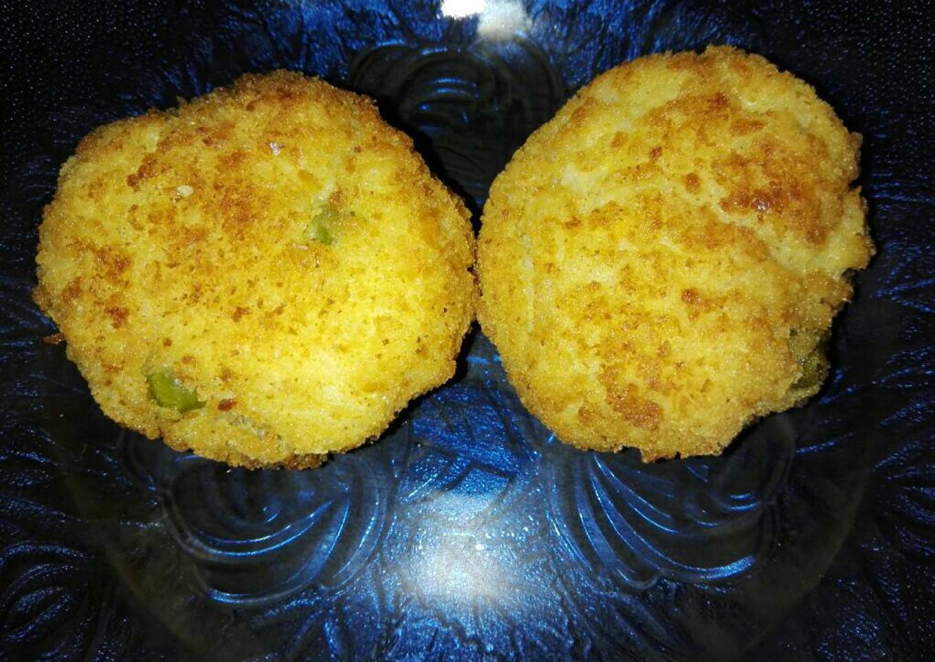 - Luego hacemos las bolas de arroz, se puede tomar la medida con una cuchara, luego pasamos las bolas de arroz por la miga de pan y freímos