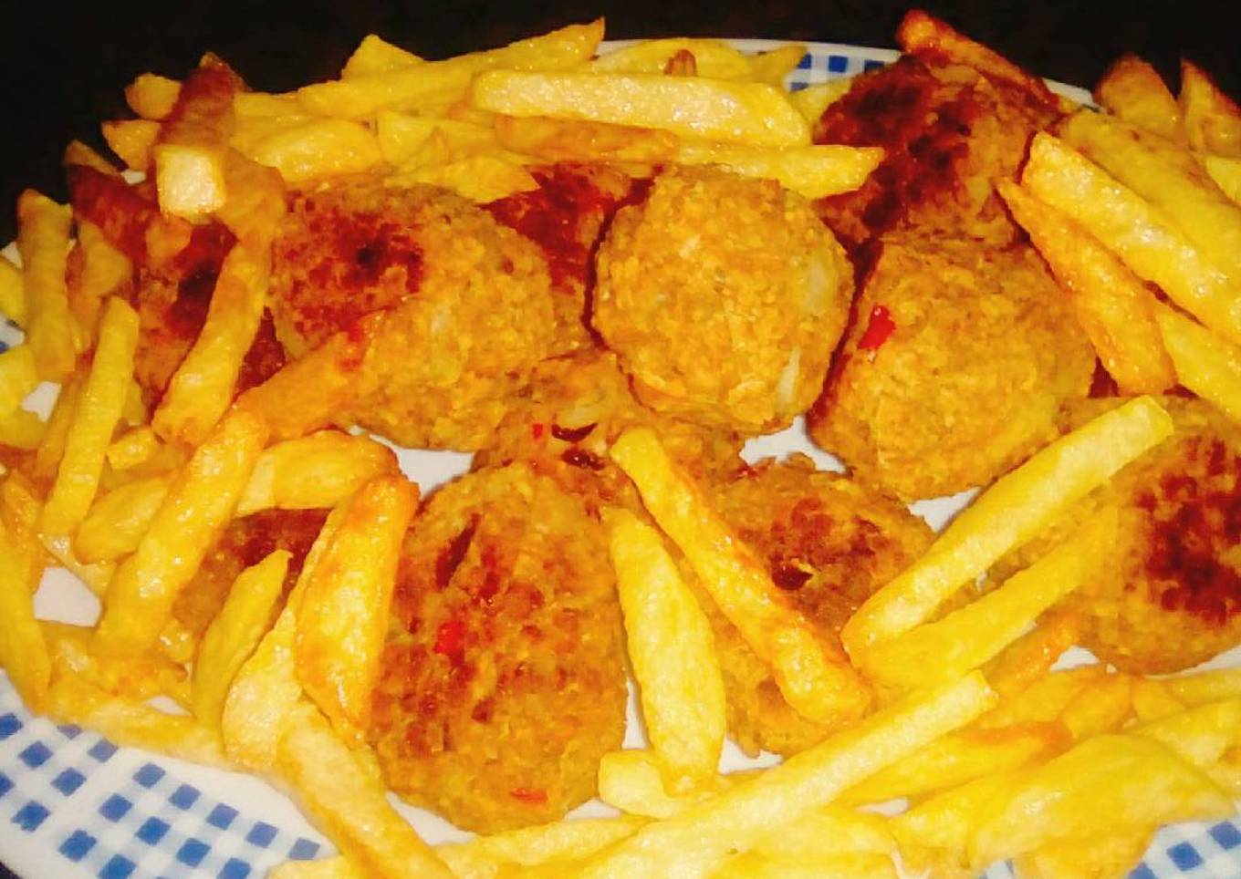 Albóndigas de soja texturizada, con trigo bulgur y papas fritas!!