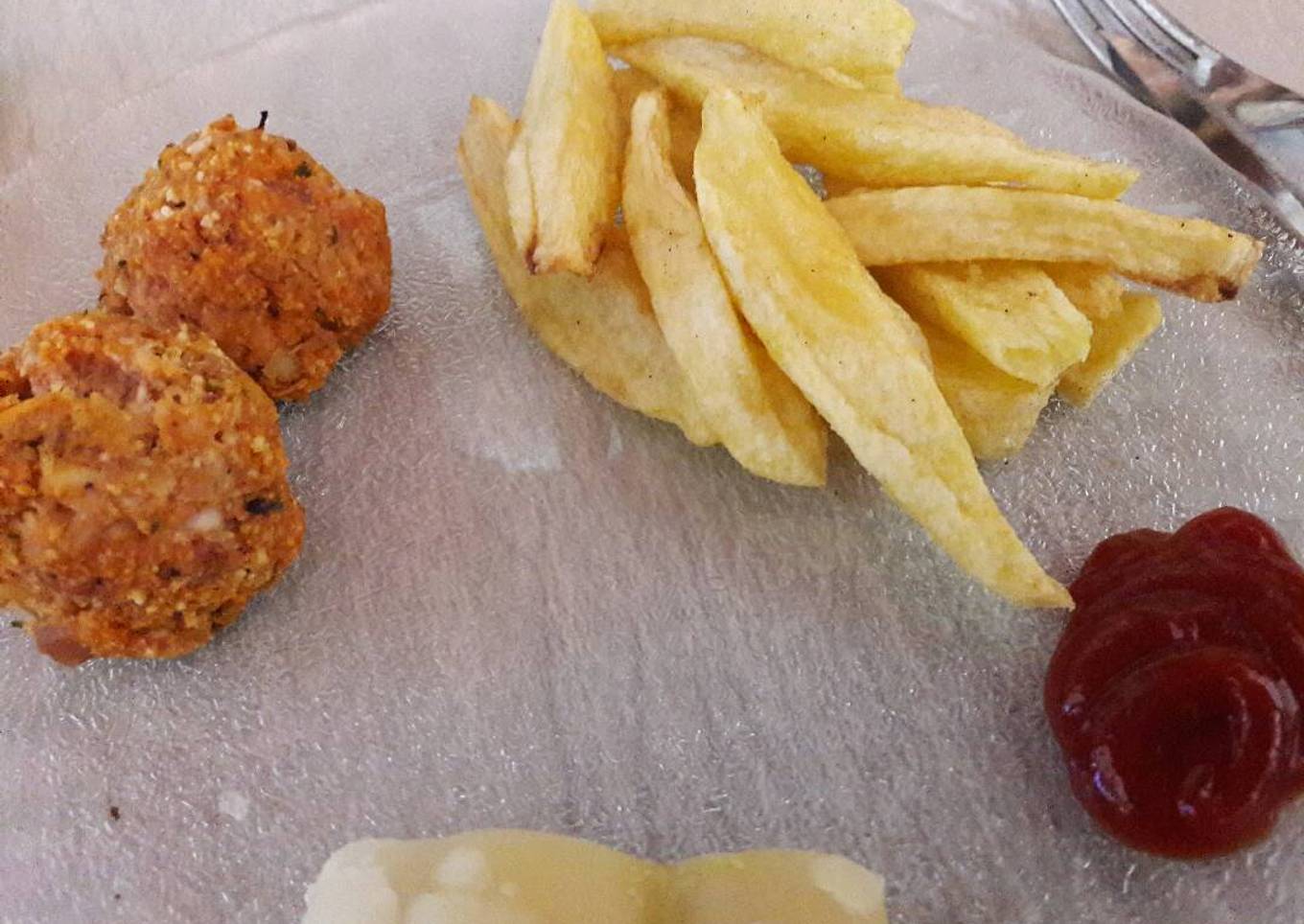 - Variante: En mi caso en ves de papas pay use papas hechas en casa (papas fritas). Con la misma preparación, se puede hacer mini-hamburguesas de pollo. Para eso, prepará las albondiguitas y luego aplástalas. Podés cocinarlas al horno y presentarlas con pan tipo chips, que se consigue en supermercados o panaderías.