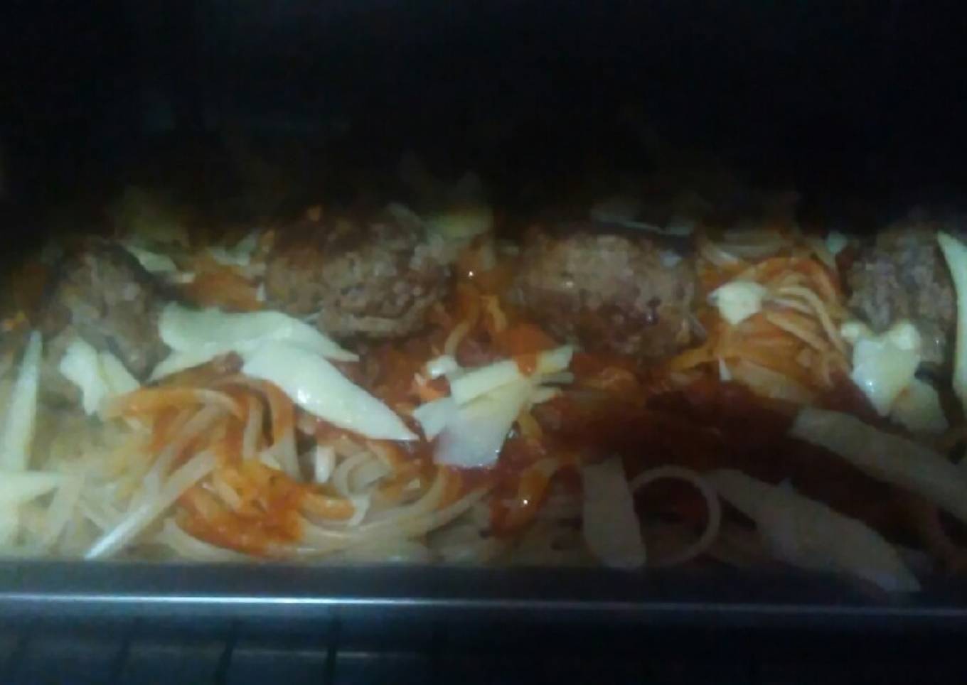 - Después que las albóndigas, la salsa de tomate y los fideos estén listos, agregar los fideos en la bandeja para hornear y agregar la salsa de tomate y acomodar las albóndigas encima. Añadir el queso mozzarella Y si tuviera queso parmesano.
