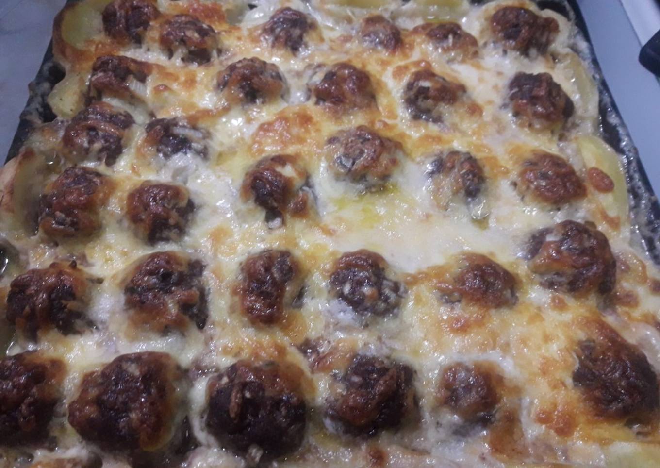 - Acomodar las papas en una fuente para horno previamente aceitada, y encima de las papas acomodar las albóndigas. Hornear durante 30 min.