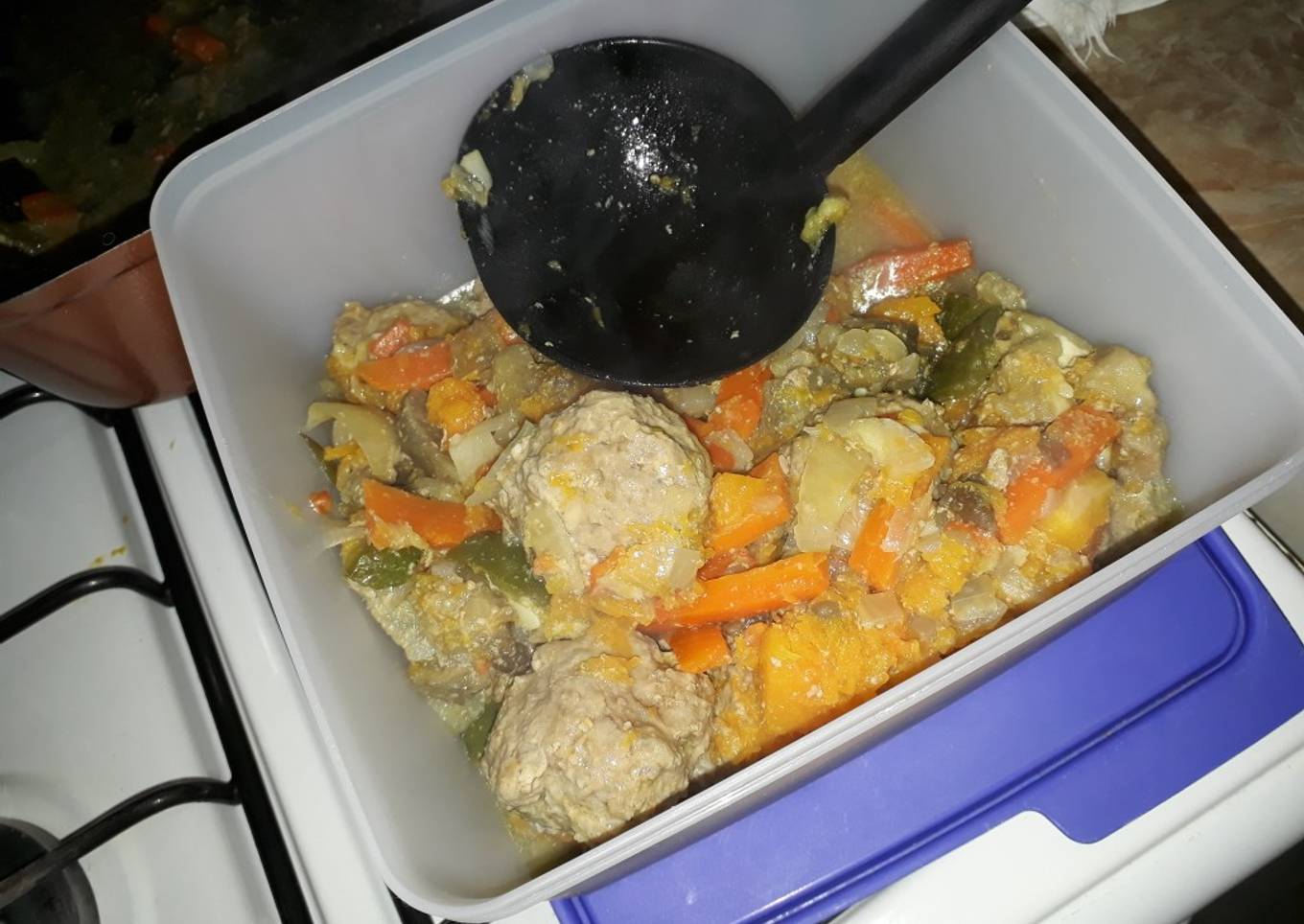 - Mezcló la carne picada con los huevos, ajo, sal y un poco de maicena y armó las albóndigas. Después de cocinar por 20' las verduras agregó las albóndigas.