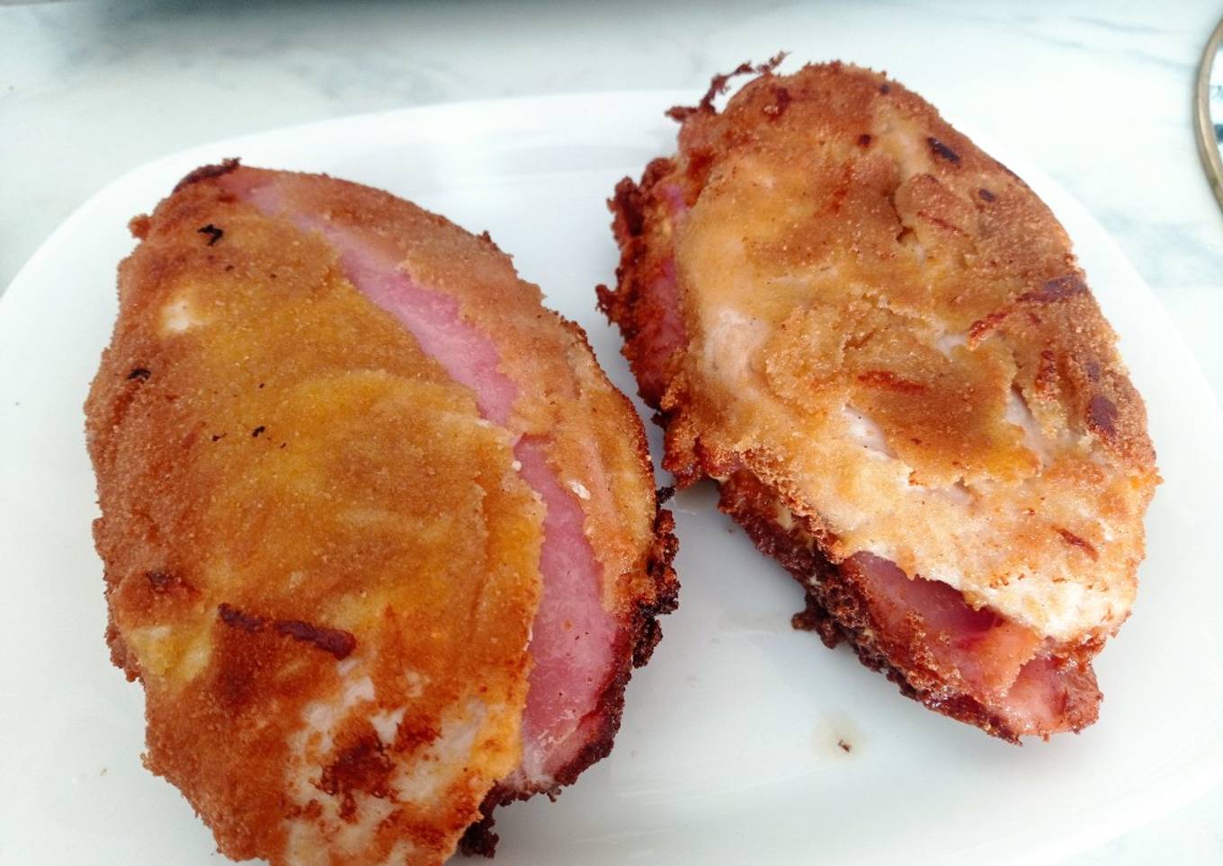 - Cortamos y aplanamos las pechugas salimentamos y ponemos el paté, queso en lonchas y jamón York, en medio de este ponemos el queso rallado